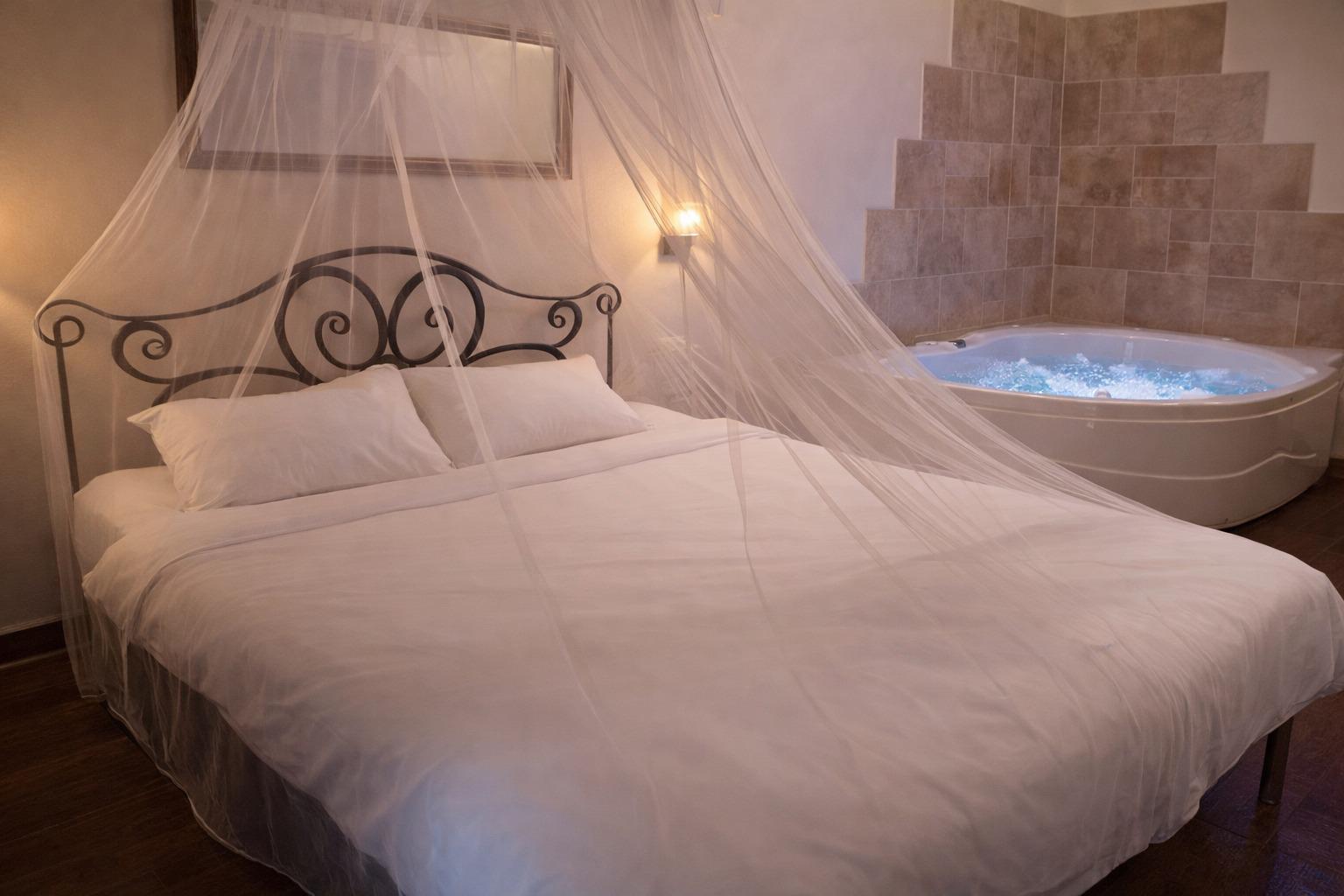 בכל סוויטה מיטה זוגית עם מזרן אורתופדי, ג'קוזי זוגי ,פינת ישיבה ,חדר רחצה מעוצב, מסך LCD בכבלים, DVD, מיזוג אוויר מטבח עם מיקרוגל, קומקום חשמלי, מקרר ופינת קפה.