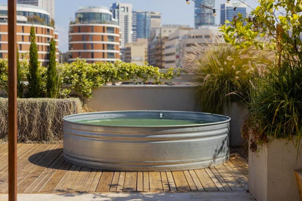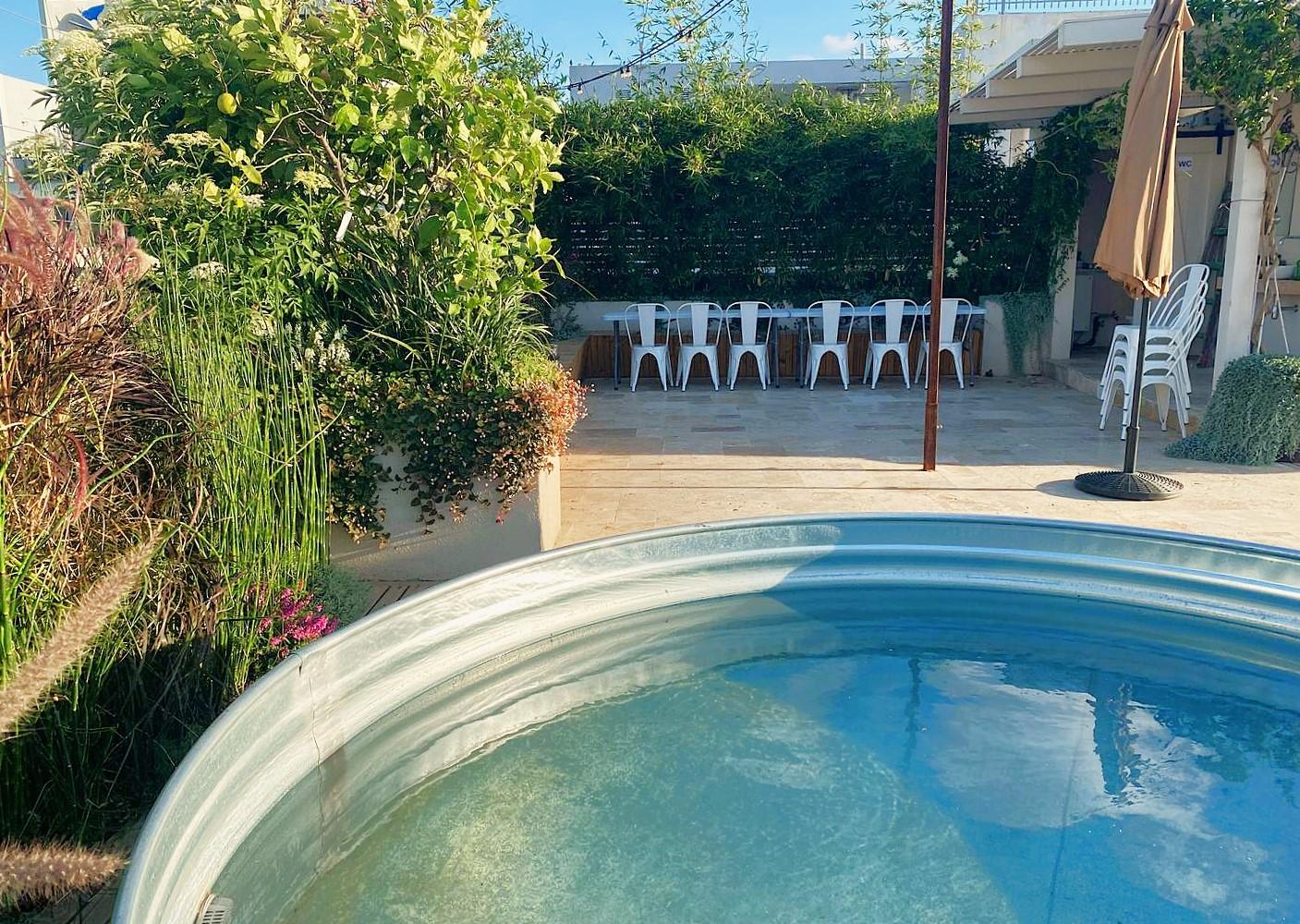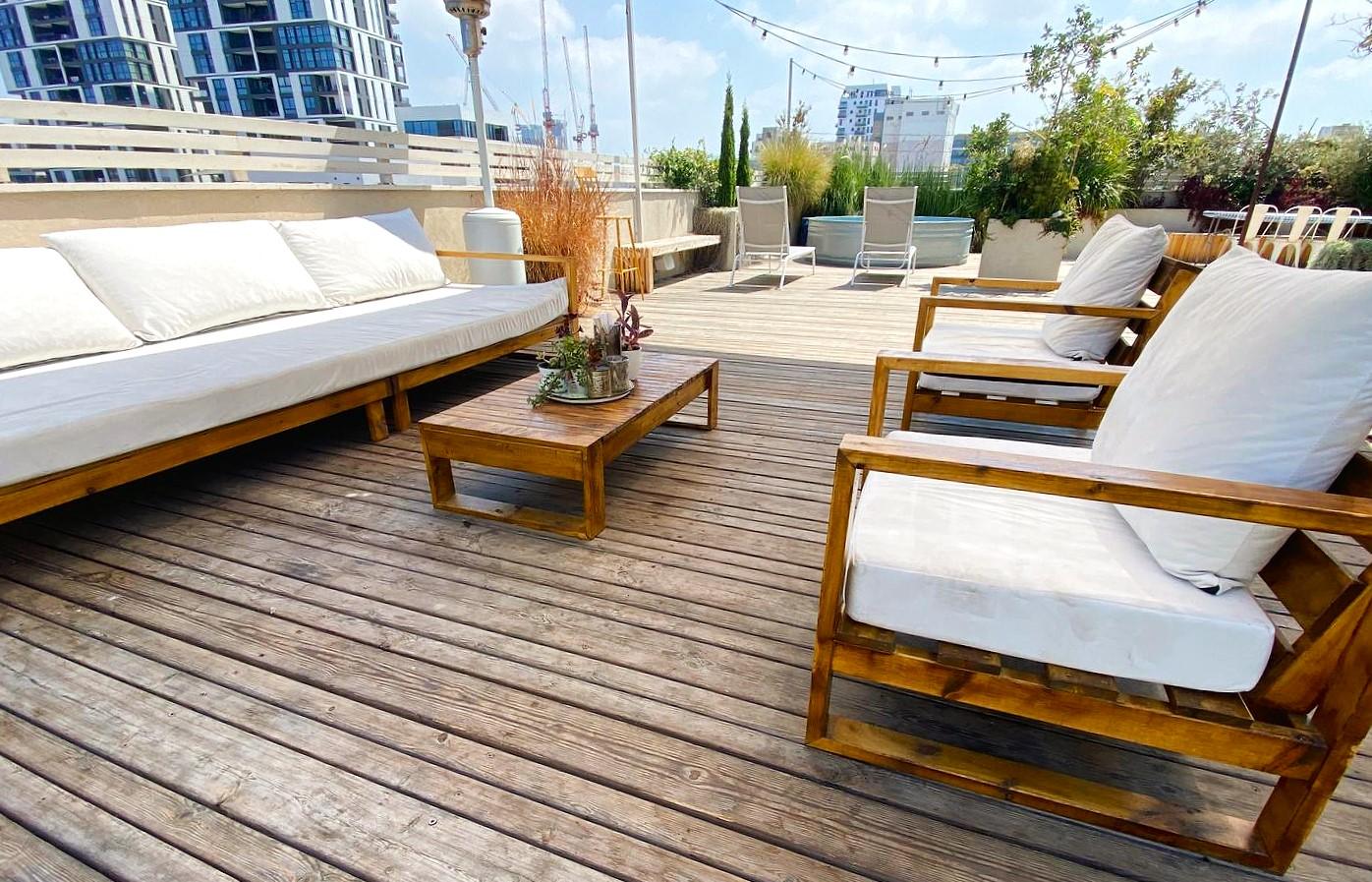 לרשותכם גג ענק המשקיף לנופים התל אביביים עם בריכת שכשוך מחוממת בחורף, פינות ישיבה ועוד.