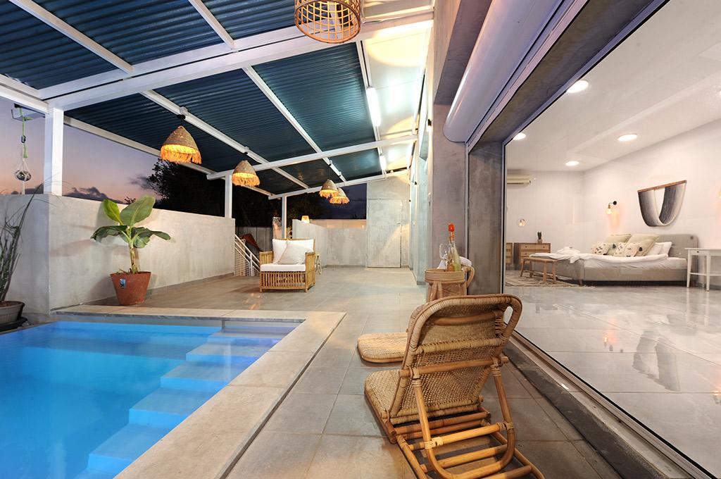 לרשותכם חצר צמודה עם יציאה מהחדר שינה - עם בריכה פרטית, מחוממת ומקורה בחורף, ריהוט גן יוקרתי ואווירת גן עדן.