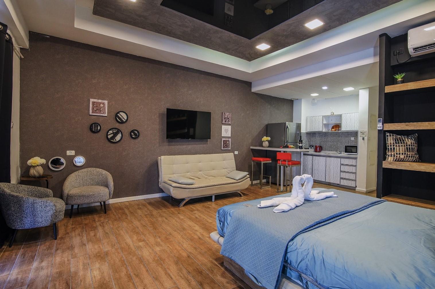 טעימה מהסוויטה: חלל מרווח ומעוצב בסטנדרט מוקפד ובו מיטה זוגית מרווחת עם מצעים תואמים לקיר מעוצב מדליק, ג'קוזי ענק ומרובע לצד כורסת פינוק, גופי תאורה דקורטיביים, פינת סלון מיוחדת מול מסך LCD בכבלים, מטבחון מאובזר, מקלחת אסתטית עם מוצרי רחצה, נוף מקסים לים ולמרינה.