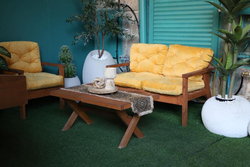 לסוויטה יש חצר פרטית ואינטימית עם פינת ישיבה מוצלת, עטופה בצמחייה ירוקה ואווירה פסטורלית ושלווה.