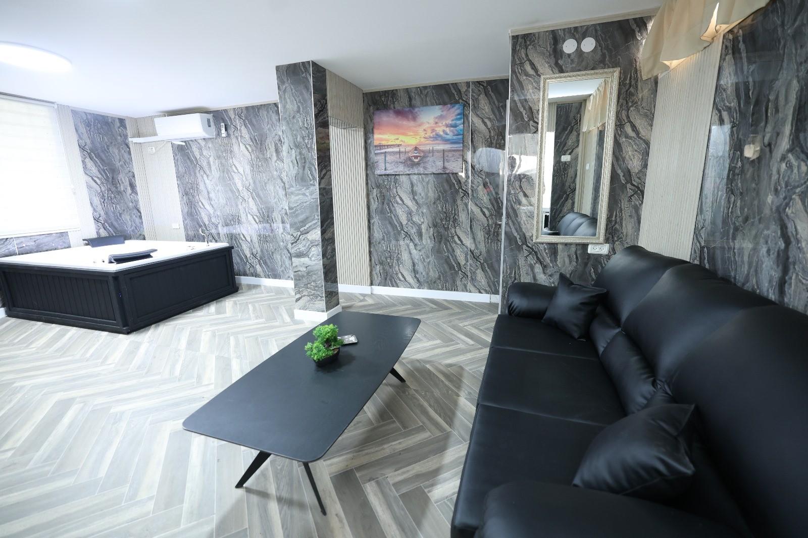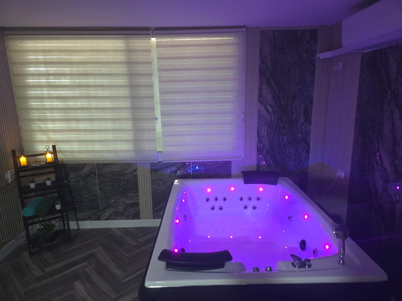 סלון מרווח עם ספת עור מדוגמת, ג'קוזי זרמים ענק מול מסך טלוויזיה חכמה עם ערוצי הוט ואינטרנט אחלוטי.