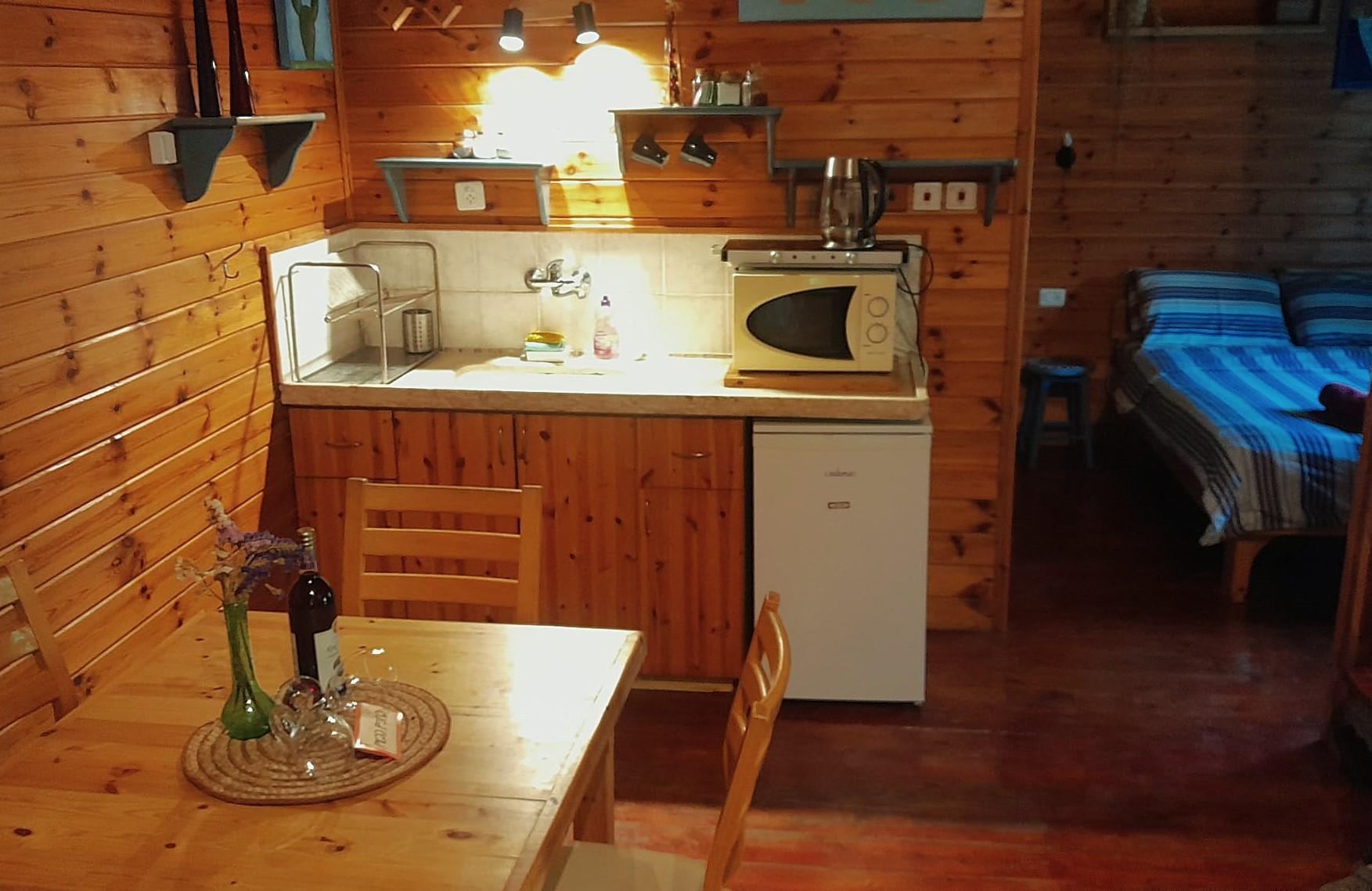 צימר 1 - מציע חדר שינה זוגי וקומת גלריה, סלון עם מערכת ישיבה נוחה ומסך טלוויזיה בכבלים, מיזוג אוויר, חדר רחצה נקי, ג'קוזי, מטבחון מאובזר ופינת אוכל.