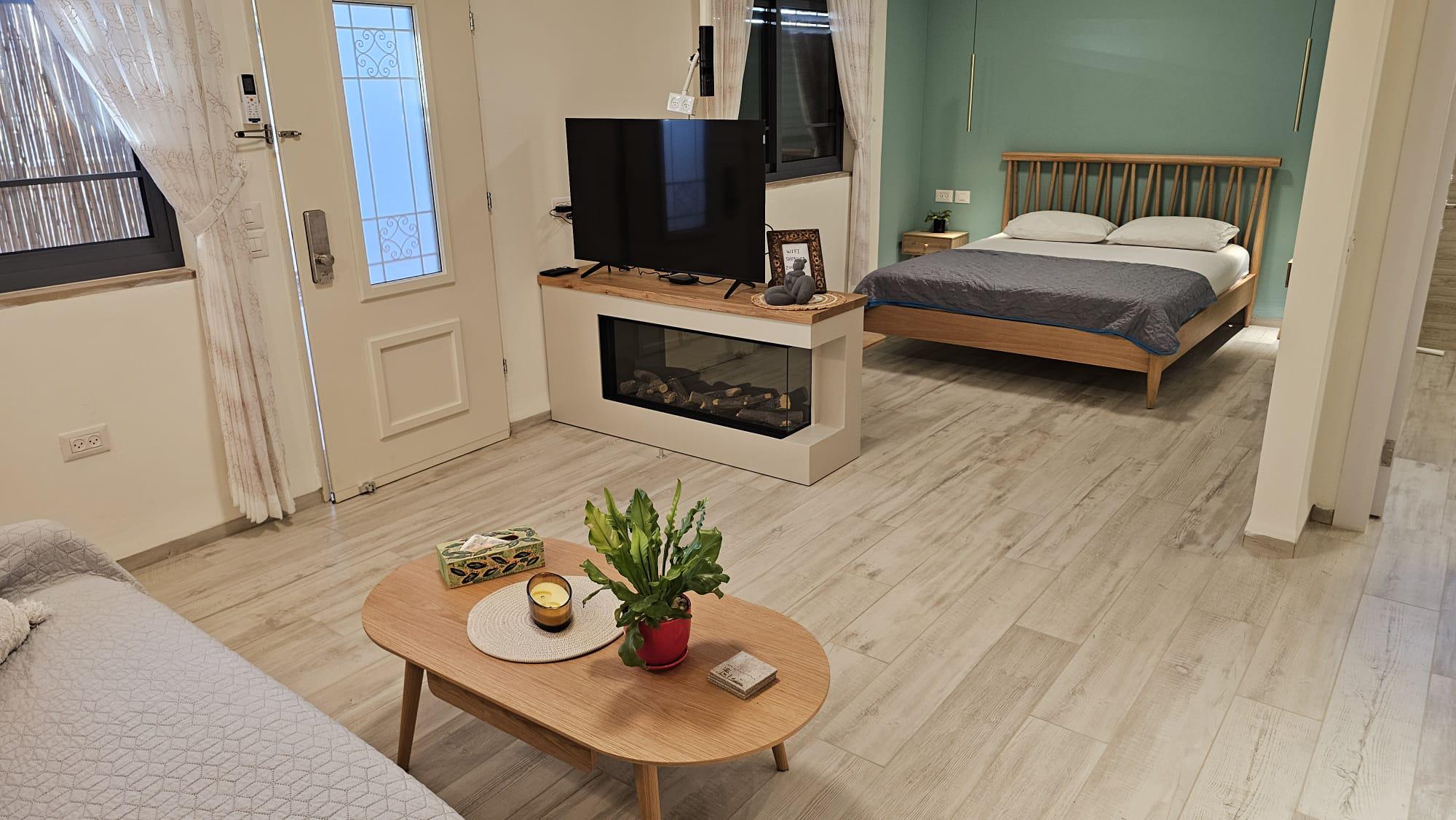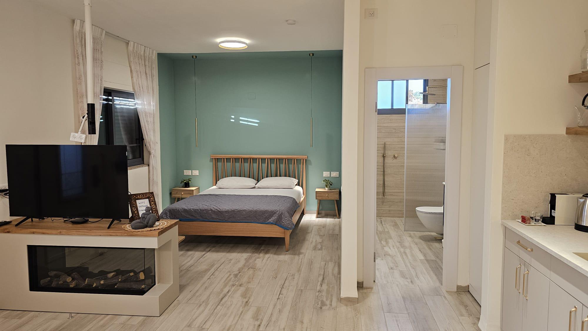 מיטה זוגית מוצעת עם מזרון יוקרתי לחוויה מושלמת ומצעים לבנים ומפנקים, מיזוג אויר, פינת ישיבה זוגית ורומנטית, שולחן קפה, מסך דק בכבלים, תאורה רומנטית, חדר רחצה הכולל אמבטיית ג'קוזי ומקלחון מפנק, ארונות אחסון, מגבות נקיות ואיכותיות, נרות ריחניים וסבונים מבושמים.