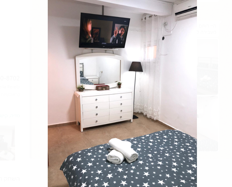 דירת 2 חדרים, מרווחת ואסתטית בה כל פינה מרוהטת היטב החל מהסלון ועד למטבח, חדרי השינה וכמובן גם בחדר הרחצה המפנק... תיהנו מג'קוזי זרמים מרובע, מרווח ומפנק בנוסף לכל, בחדר השינה ממתינה לכם מיטה זוגית מפנקת ומזמינה. אבזור מלא במטבח המרווח הכולל מוצרי חשמל, כלי הגשה, פינת קפה מקרר ועוד. מסך טלוויזיה דק בכבלים עם מגוון ערוצים, מיזוג אוויר ותאורת חדר רומנטית מיוחדת.
